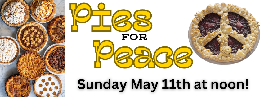 Plan to join us for this delectable fundraiser and satisfy your tastes for pies of all types: savory, sweet, cream pies, fruit pies, quiche, meat pies, tarts, vegan, gluten-free, etc. Pieces of pie and whole pies will be available, along with ice cream or other toppings you might enjoy.